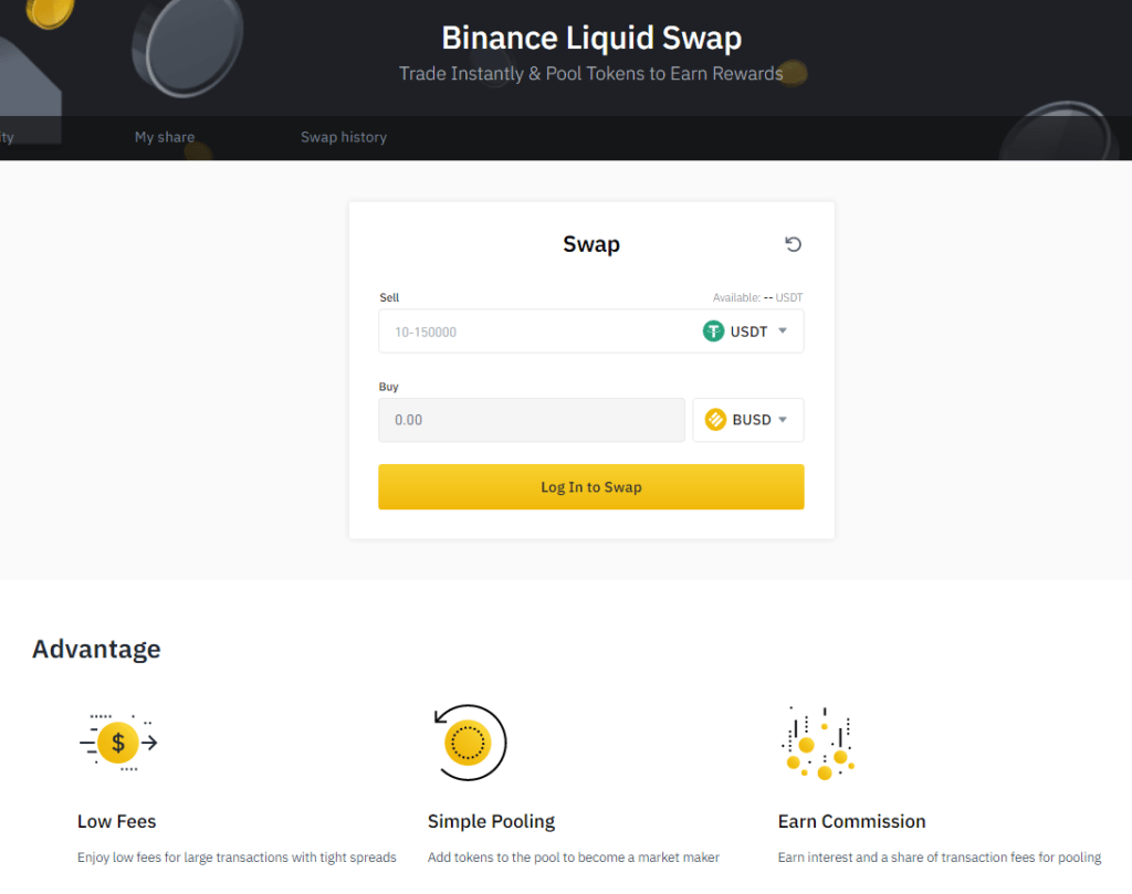 Binance Liquid Swap is based on a pool of liquidity. There are two tokens in each pool, and the relative amount of tokens determines the price between them and can always be traded as long as there are corresponding tokens in the pool. Binance Liquid Swap offers more stable prices and lower fees for large transactions.
