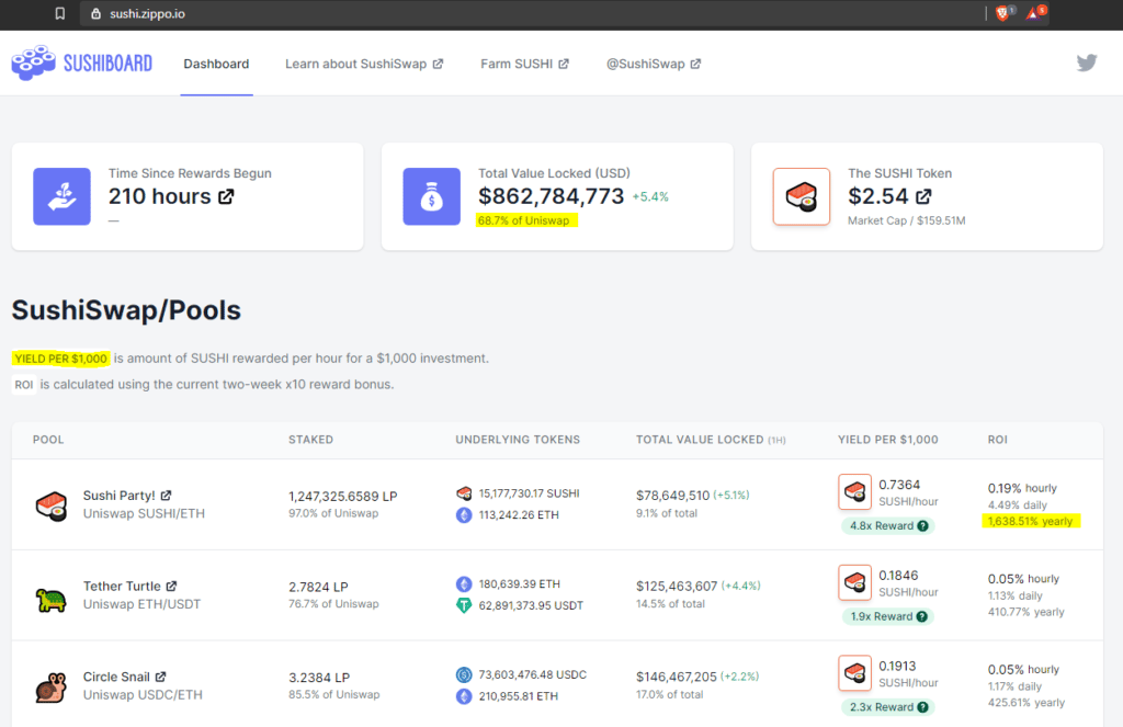 Since then, the total value locked (USD) on 6th September is $860M according to the SushiBoard, which is 68.8% of the value that is locked up in its forked parent Uniswap! Amazing for just being launched a week ago.