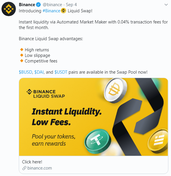 Another day, another Swap Product gets released. It is the 4th of September, 2020 and this time it is Binance has released their own Automated Market Maker (AMM) called Binance Liquid Swap. It is an automated mechanism thats provides more stable prices and low fees for large transactions.