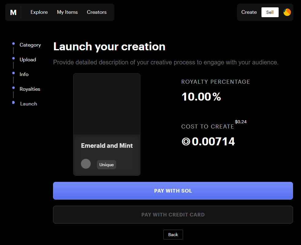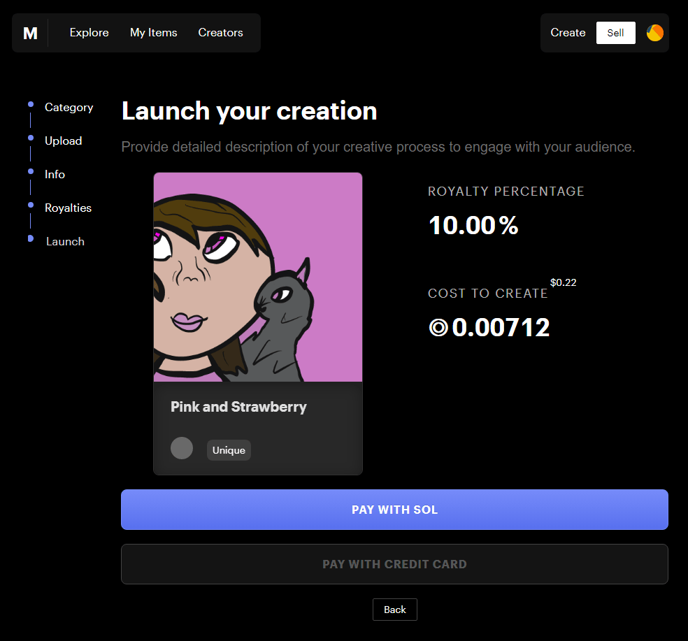 After making sure you have your wallet connected, click the “Sell” button at the top right. From here you are presented with 4 options for different ways to sell your NFT that you have already minted. I found the “Limited Edition” method has a lot of transactions to get it setup and it actually costs more than just selling your unique NFT “Sell an Existing Item”. The price in USD can range from $1.13 to $3. So make sure you have some SOL in your wallet to cover this.