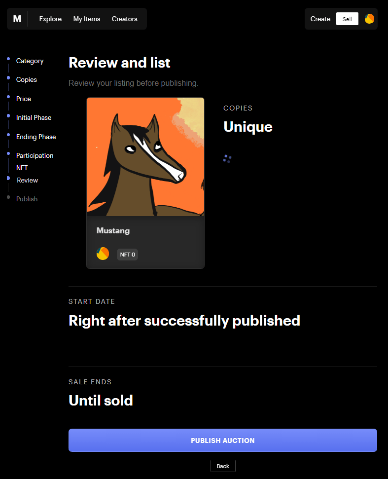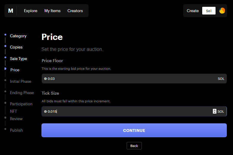 For this example we are going to sell an existing item. I set the price floor is $1 USD and the incremental bid increase (tick) size to be $0.50 USD (this fluctuates depending on the price of SOL). You have to specify this in $SOL so again, use Coingecko for this to make sure you don’t finger fault it.